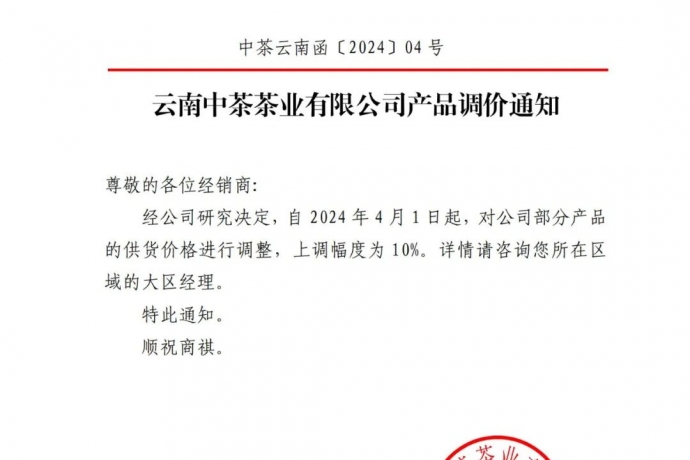 2024年云南中茶茶业有限公司产品调价通知